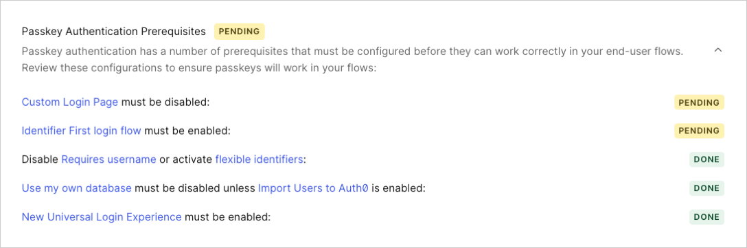 To enable passkeys as an authentication method for your database connection, you must configure your Auth0 tenant to fulfill the following prerequisites. If these prerequisites are not met and you try to enable passkeys, the Auth0 Dashboard displays the Passkey Authentication Prerequisites readiness checklist and shows any unmet requirements.