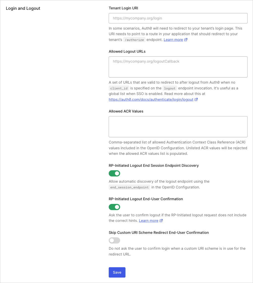 For Auth0 tenants created on or after 14 November 2023, RP-Initiated Logout End Session Endpoint Discovery is enabled by default.