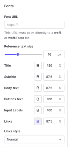 To change the default font, enter the URL to any WOFF (Web Open Font Format) file in the input field. Your WOFF files need to be hosted using a CDN with CORS enabled or a hosting site with Access-Control-Allow-Origin header.Under the font URL panel, adjust the general text size under the Reference text size pixel option. You should note the rest of the options do not change when the reference text is changed.Change the following elements individually: