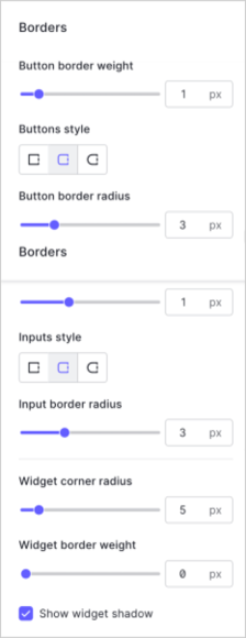 To customize the borders, buttons styles, input fields, and widget corners adjust the slider or choose from the available options.