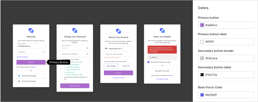 To create your desired Universal Login theme, the Styles menu contains the following components:Color