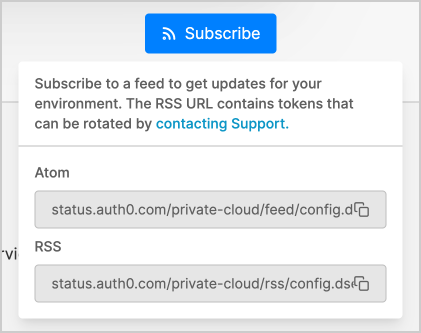 Select an Environment, and then select Subscribe. Subscribe to the Auth0 Atom or RSS feed by copying the generated URL in the ‘Subscribe’ box to get status updates that affect your environment.The generated ATOM / RSS Feed URL is unique per Private Cloud environment and contains tokens that can be rotated by contacting Support.