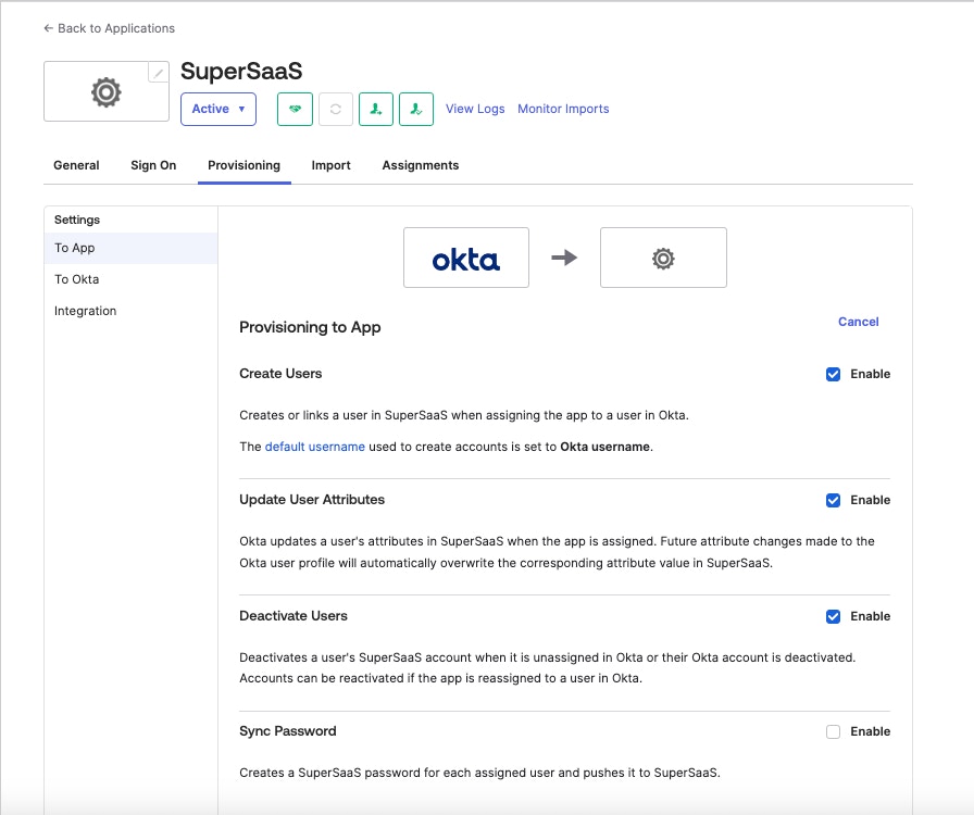 Rendez-vous à Fourniture > Paramètres > À l’applicationet sélectionnez Modifier, puis activez les opérations Créer des utilisateurs, mettre à jour les attributs des utilisateurs, et Désactiver utilisateurs. Sélectionnez Enregistrer.