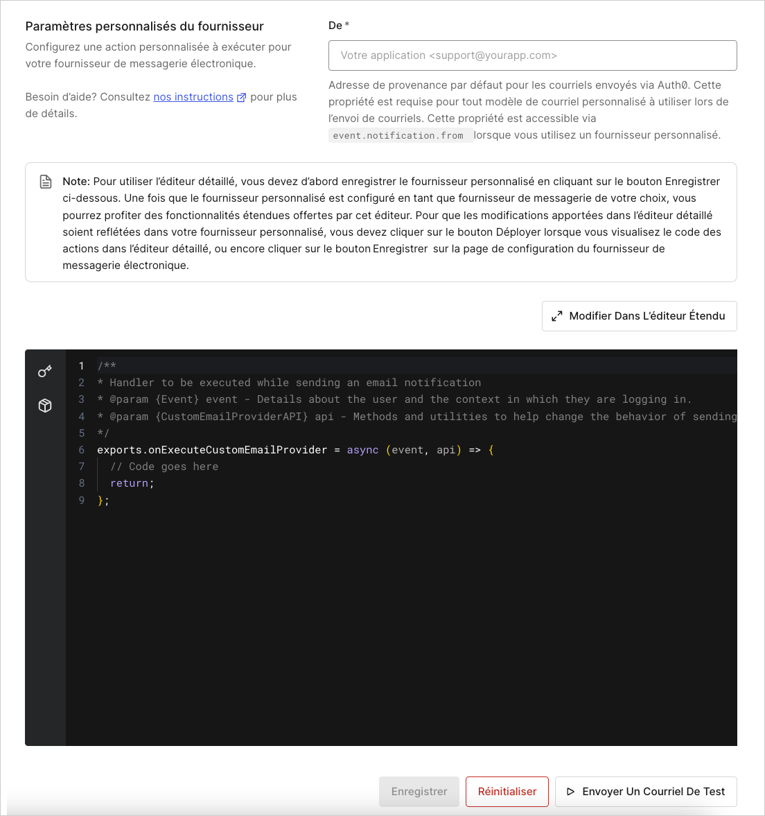 Pour utiliser l’Éditeur étendu, vous devez d’abord enregistrer votre configuration de fournisseur de courrier électronique personnalisé.