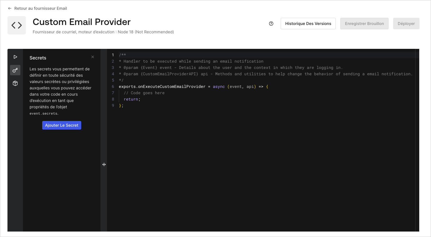 - Dans l’éditeur de code, ajoutez le code d’action approprié pour transmettre les messages à votre fournisseur de courriel personnalisé. Consultez la documentation de votre fournisseur pour savoir comment transmettre les messages à son API. Comme pour les autres actions, utilisez Management API pour gérer l’action et ses versions.