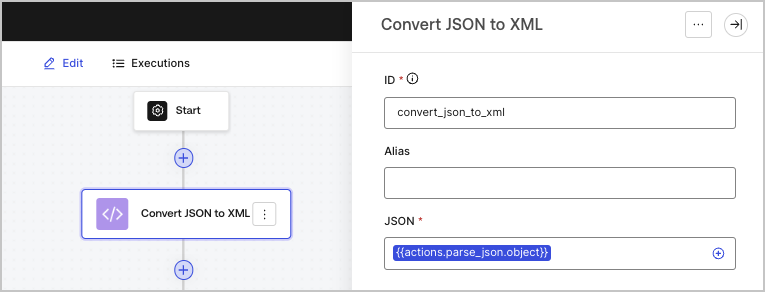 | JSON (obligatoire) | L’objet JSON qui sera converti en chaîne XML. |