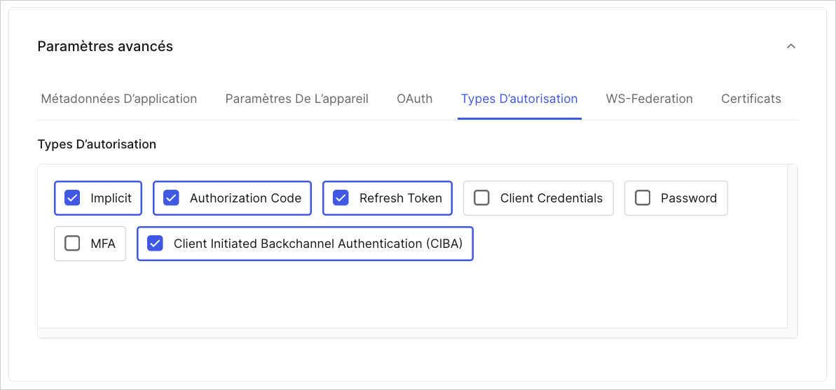 - Créez une application, puis activez Client Initiated Backchannel Authentication (Authentification Back-channel initiée par le client) (CIBA) dans l’onglet Grant Types (Types d’autorisation) :