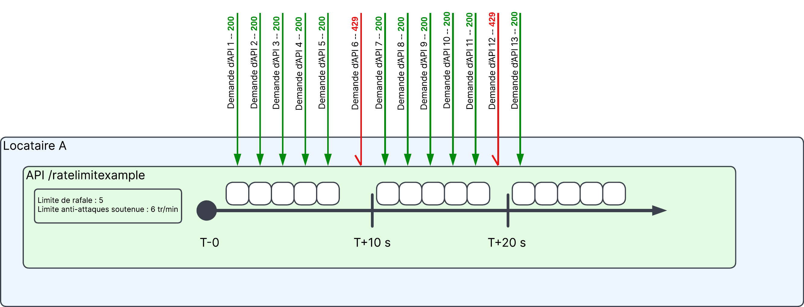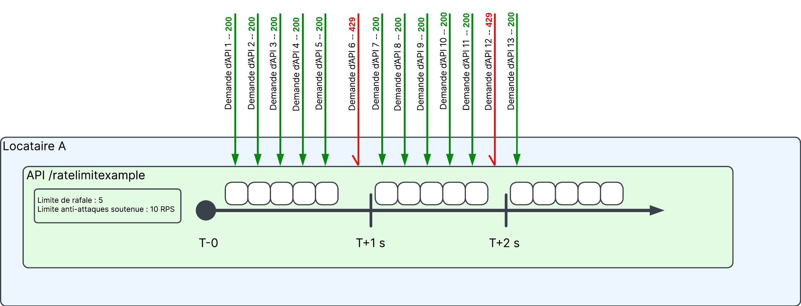 - T0 - T1sec. : l’utilisateur final effectue six requêtes dans la première seconde. Cinq requêtes - correspondant à la limite de charge subite - reçoivent une réponse de