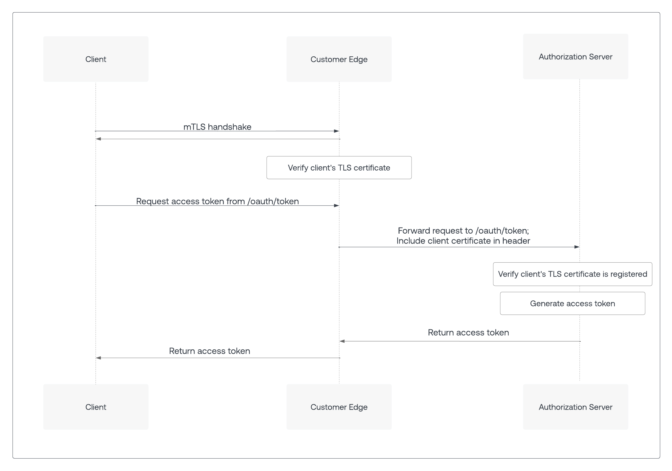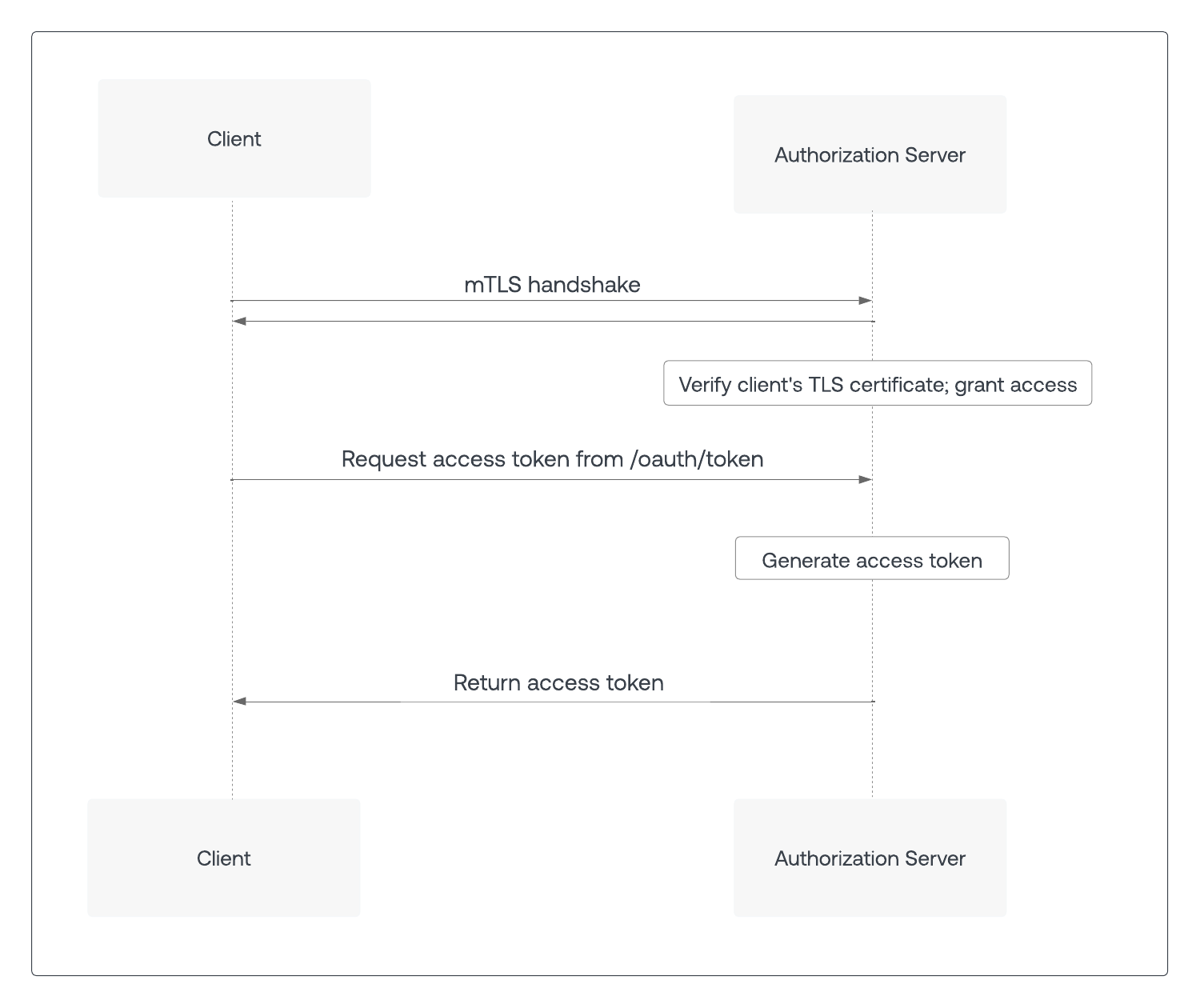 /oauth/token endpoint on the authorization server using an mTLS connection, the resulting access token contains information that the resource server uses to verify that the client’s TLS certificate matches that of the access token.