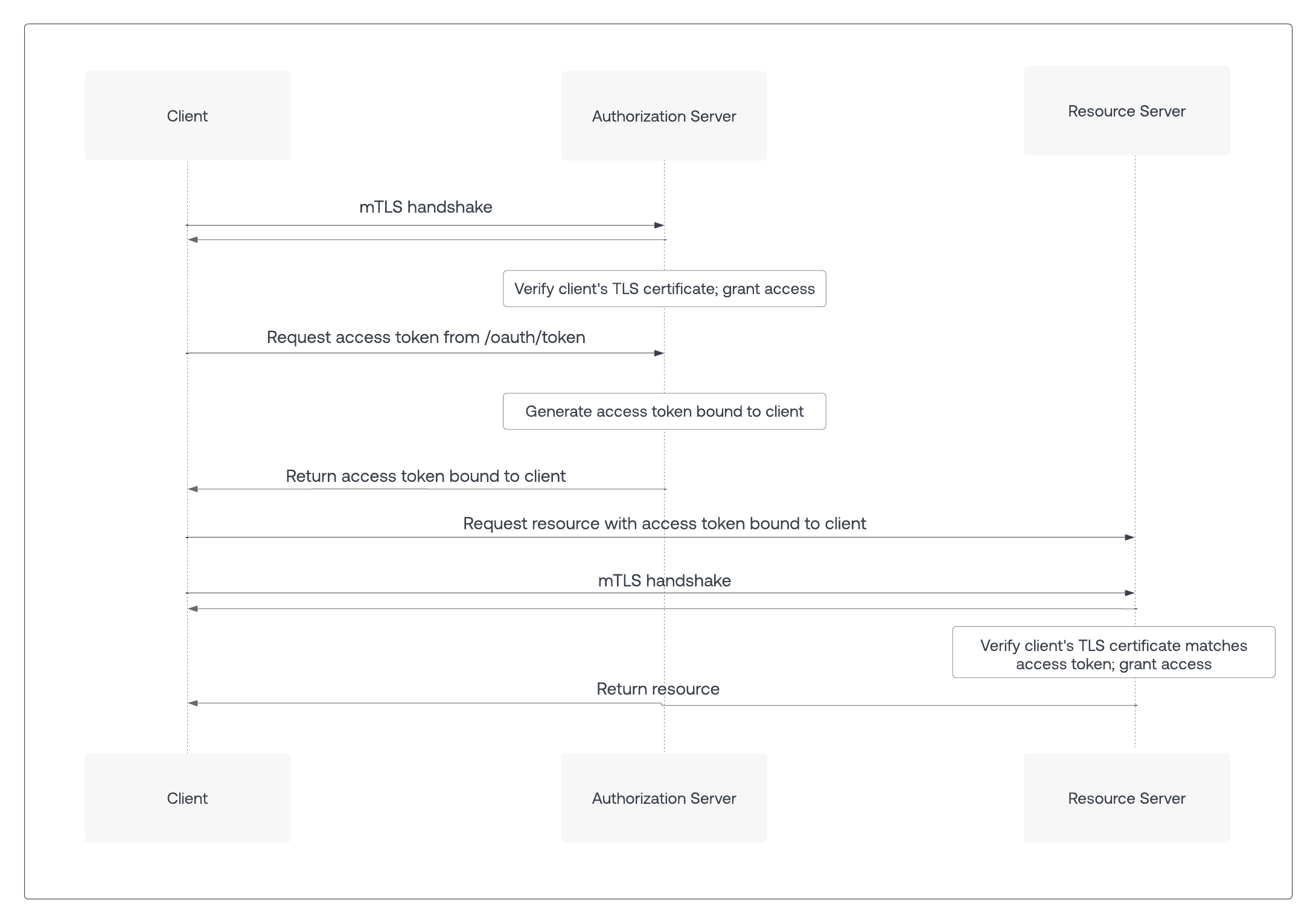 When the client calls the resource server with a mTLS-bound access token, the resource server requests a mTLS certificate from the client during the TLS handshake. The resource server should reject requests with an access token that does not match that client certificate with a 401 HTTP status code and an invalid_token error code. To learn more, read Configure Resource Server for Sender Constraining.