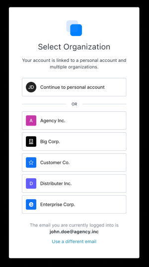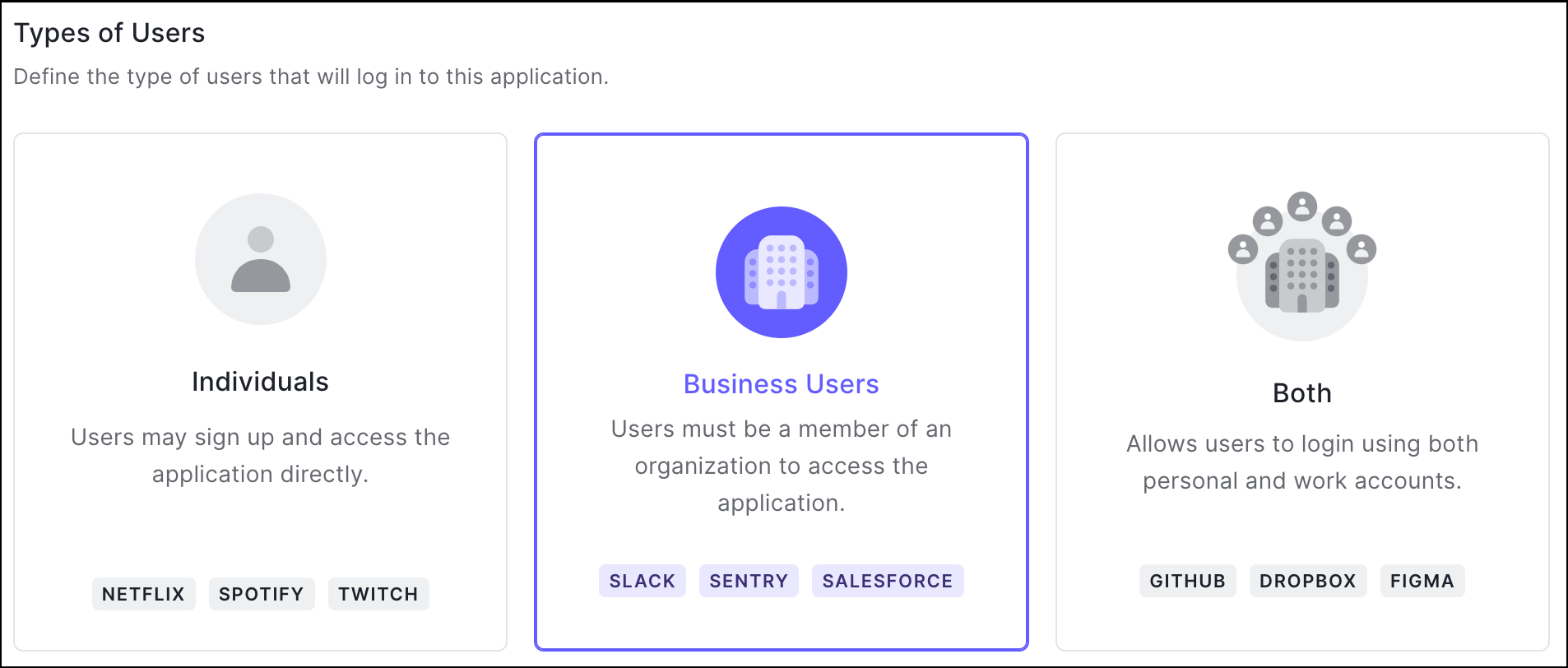 Applications designed explicitly for consumers - for example, Netflix or Spotify - likely do not need Organization management. By choosing Individuals, users log in to the application directly and Organization context is not provided. B2B or SaaS applications - for example, Slack or Jira - are better-served by Business Users, so end users can only access your application in the context of an Auth0 Organization. Users in multiple Organizations are directed to the Organization Picker after the login flow, which displays the first 20 organizations they joined.
