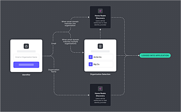 The goal of Identifier First Authentication is to determine which connection or Identity Provider (IdP) to route the user. Once the organization (if any) is determined, Auth0 applies Identifier First Authentication with Home Realm Discovery: