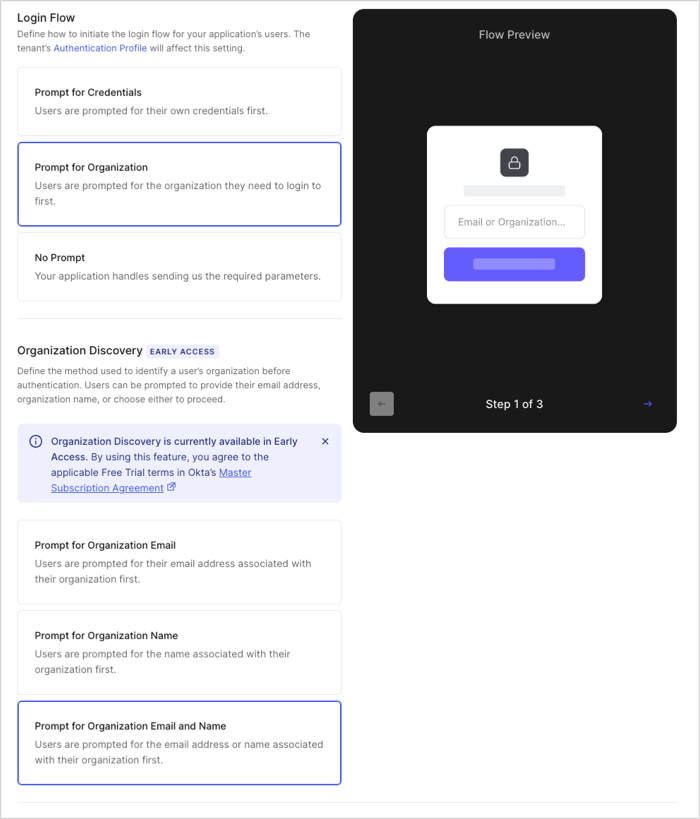 Administrators can further curate the end user experience by enabling the Prompt for Organization toggle, which requires users to identify the Organization they’re logging into by either the Organization Name or Organization Email.