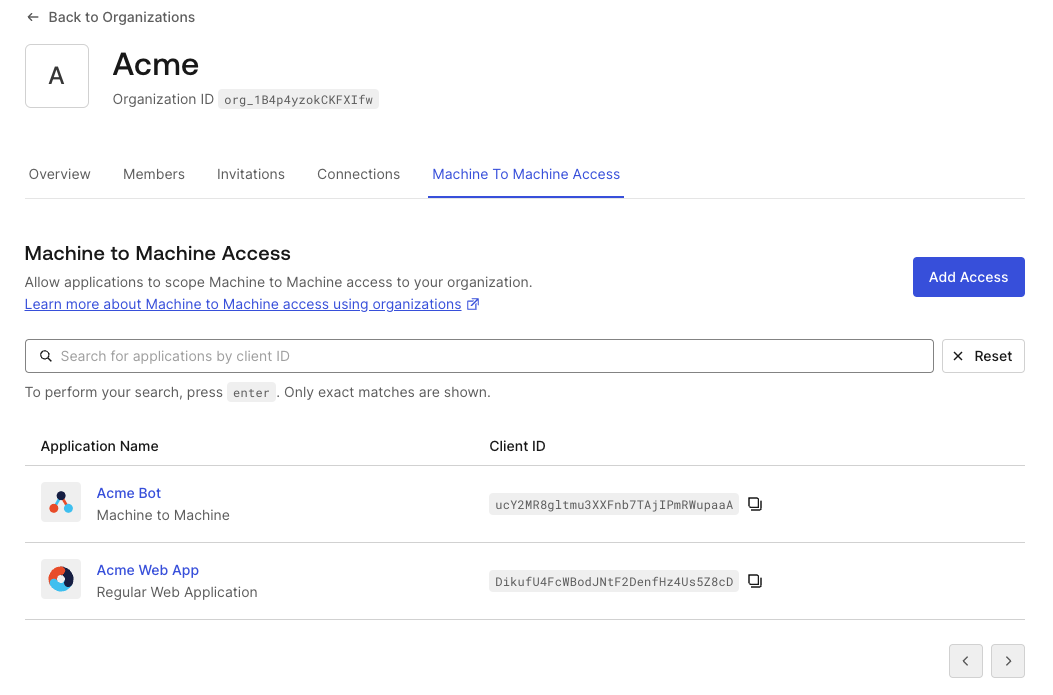 - Select the Machine-to-Machine Access tab. You will get a paginated list of all the applications that can access an API for this organization via direct association.