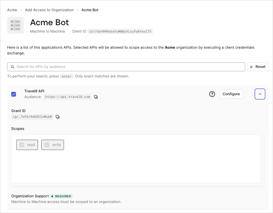 To associate an application’s client grant to an organization via the Auth0 Dashboard: