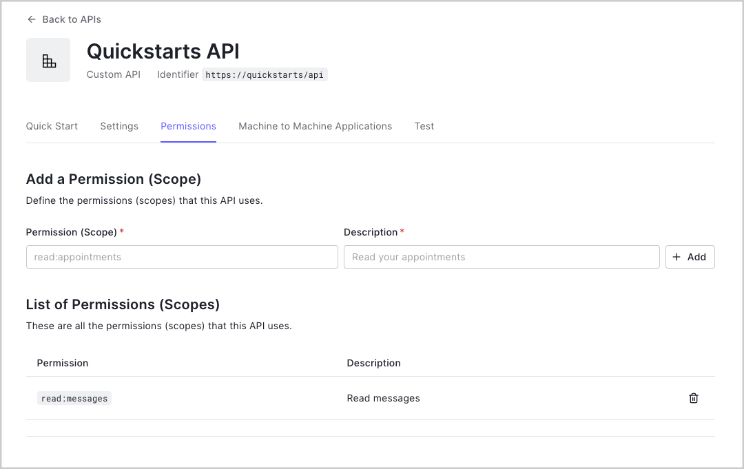access level, and a write access to that resource if they have the administrator access level.You can define allowed permissions in the Permissions view of the Auth0 Dashboard’s APIs section.