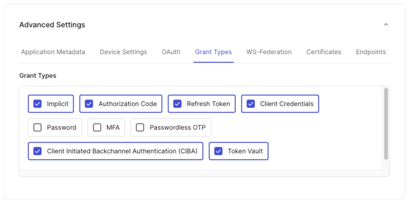 3. Under Advanced Settings > Grant Types, select the Token Vault grant type.