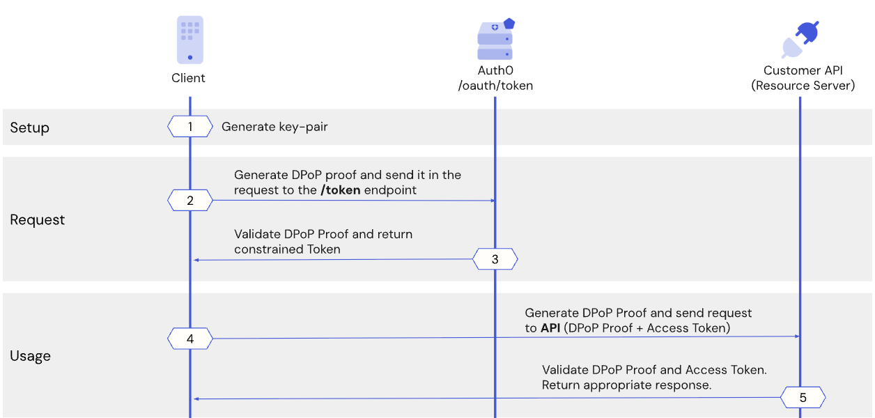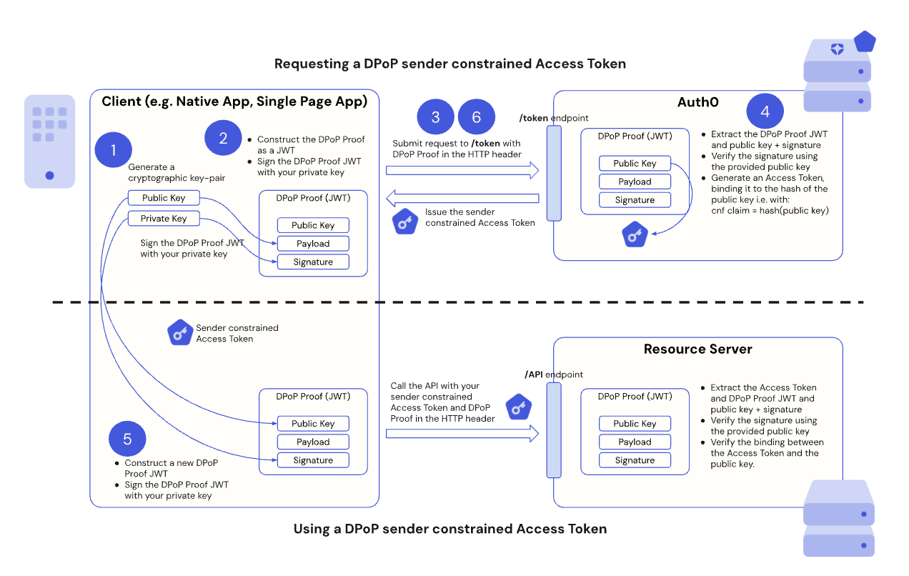 The following diagram shows the end-to-end flow for sender constraining tokens using DPoP in Auth0: